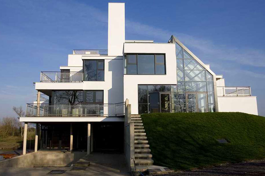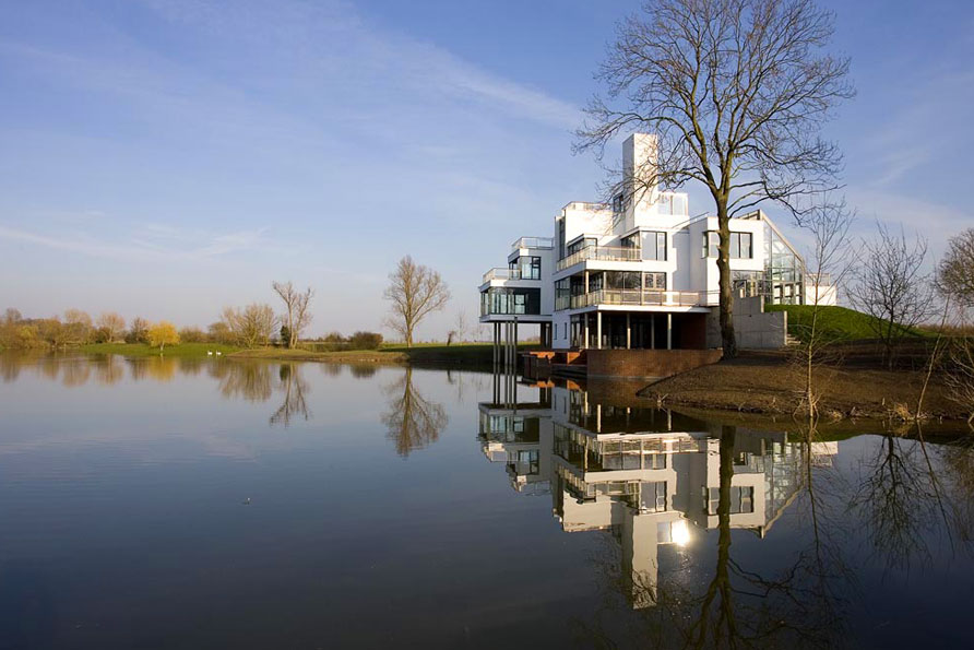 A modern country house built over five floors on the banks of an eight acre lake in Bedfordshire. The house is constructed as a reinforced concrete frame and is a self-build project which featured on the Channel 4 TV series Grand Designs.