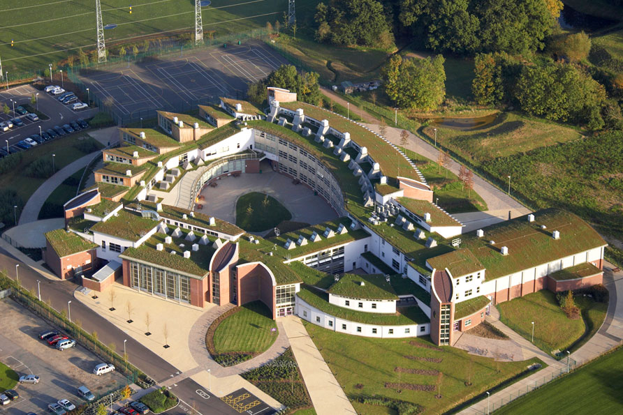 A secondary school for the Diocese of Rochester. Mostly steel framed with in-situ cantilevered, curved stair towers. Long span sports hall and deep Vierendeel trusses provide interesting structural features.